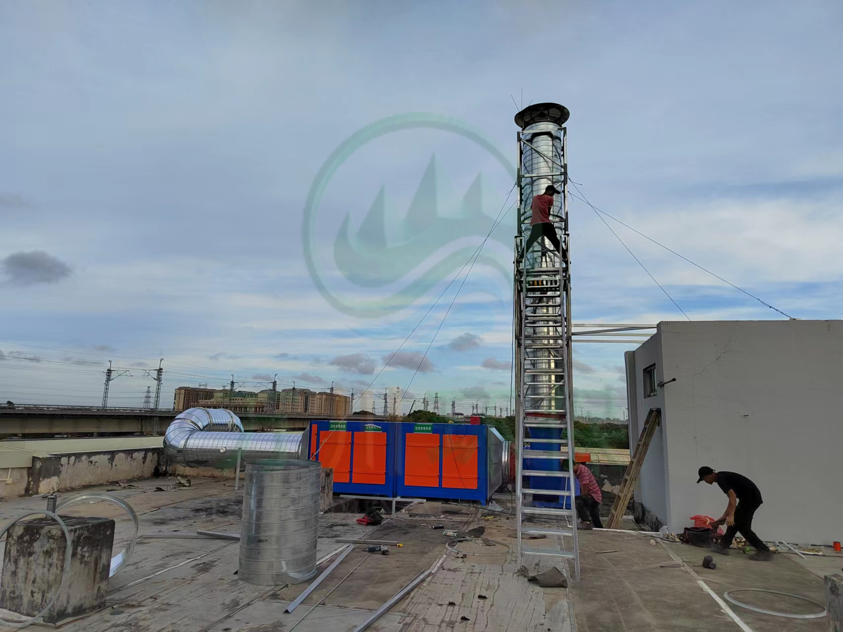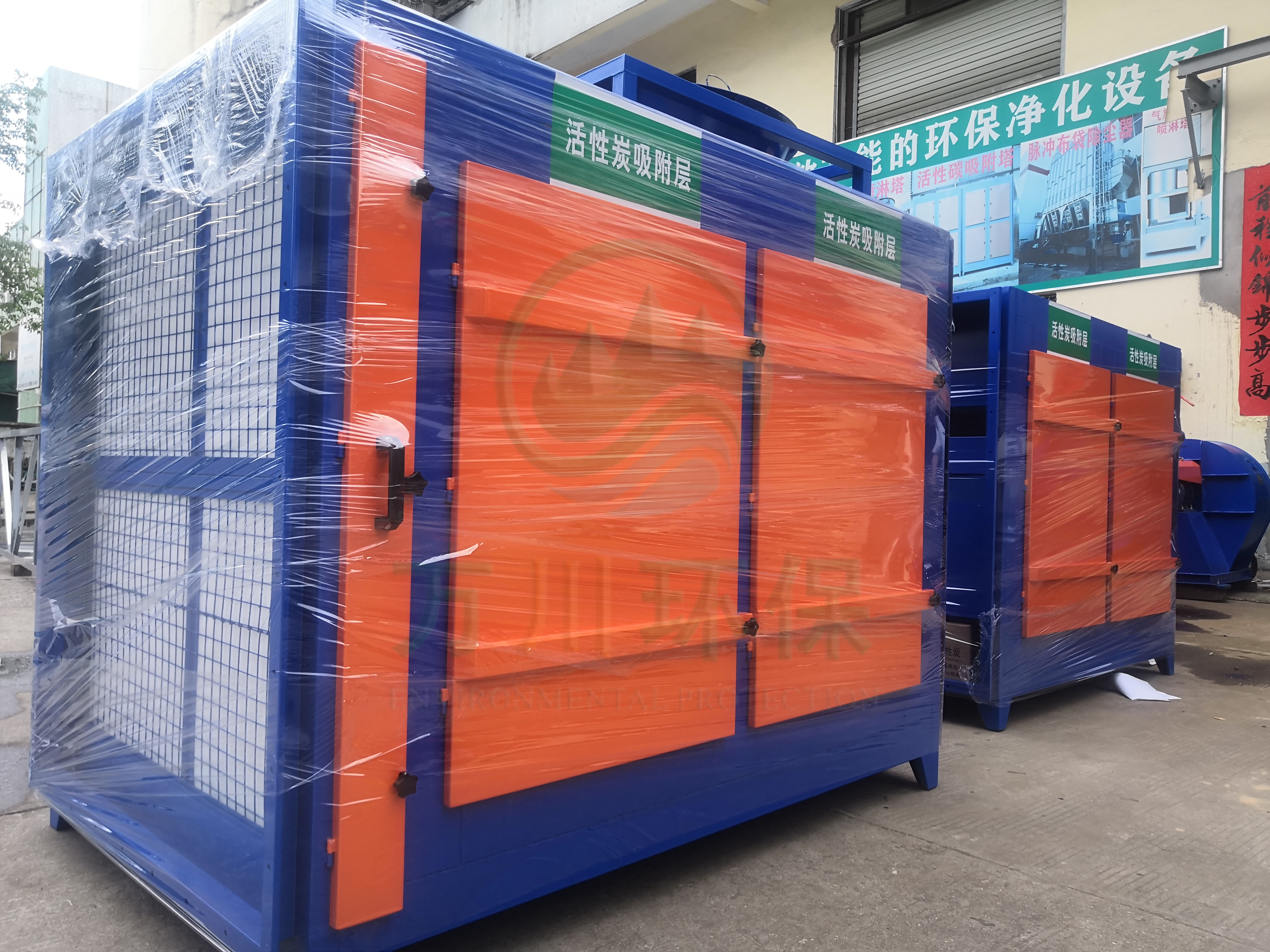 根據廢氣類型和場地需求我們采用兩級活性炭吸附法對其進行處理。配套兩臺1萬風量的碳鋼材質活性炭吸附塔與大功率離心風機,自帶自動化控制系統。