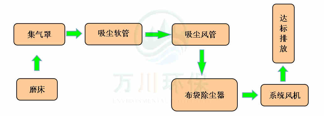 磨床生產時產生的粉塵通過集氣罩、吸塵軟管進入到脈沖布袋除塵器中過濾凈化,粉塵落入灰斗,凈化后的廢氣通過系統(tǒng)風機達標排放。